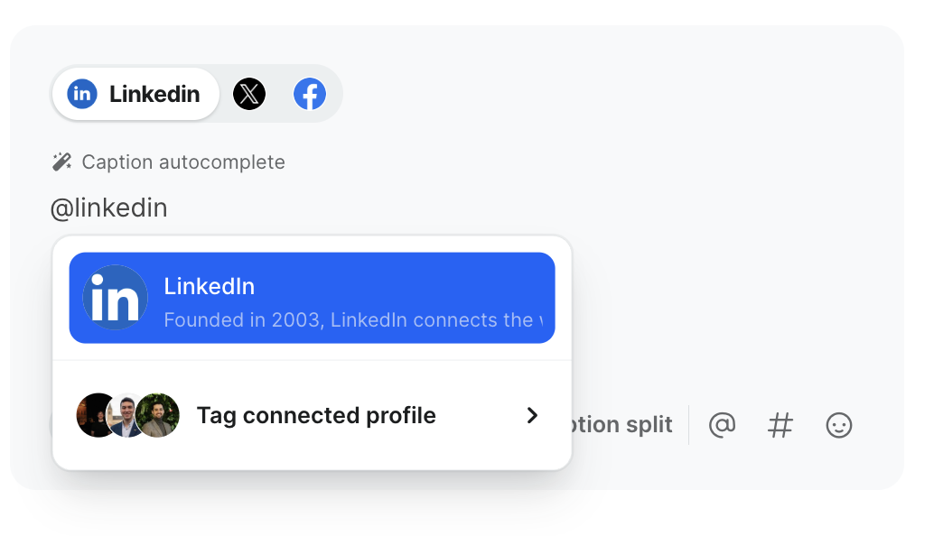The best way to start tagging people and businesses is to first write your full caption and then split your caption between the different channels. Once your captions are split, you can start tagging the appropriate person/business per social media channel.