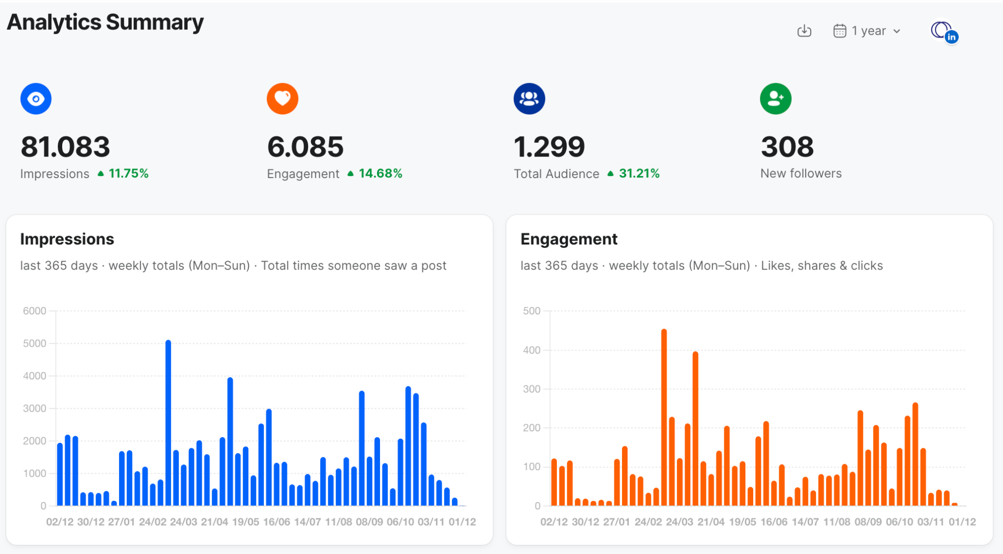 Over the past year, their LinkedIn presence grew by 31.21%, adding 308 new followers in a niche where every new connection is valuable. Their content generated 81,083 impressions (+11.75%) and 6,085 engagements (+14.68%), proving that the right message delivered consistently truly resonates.
